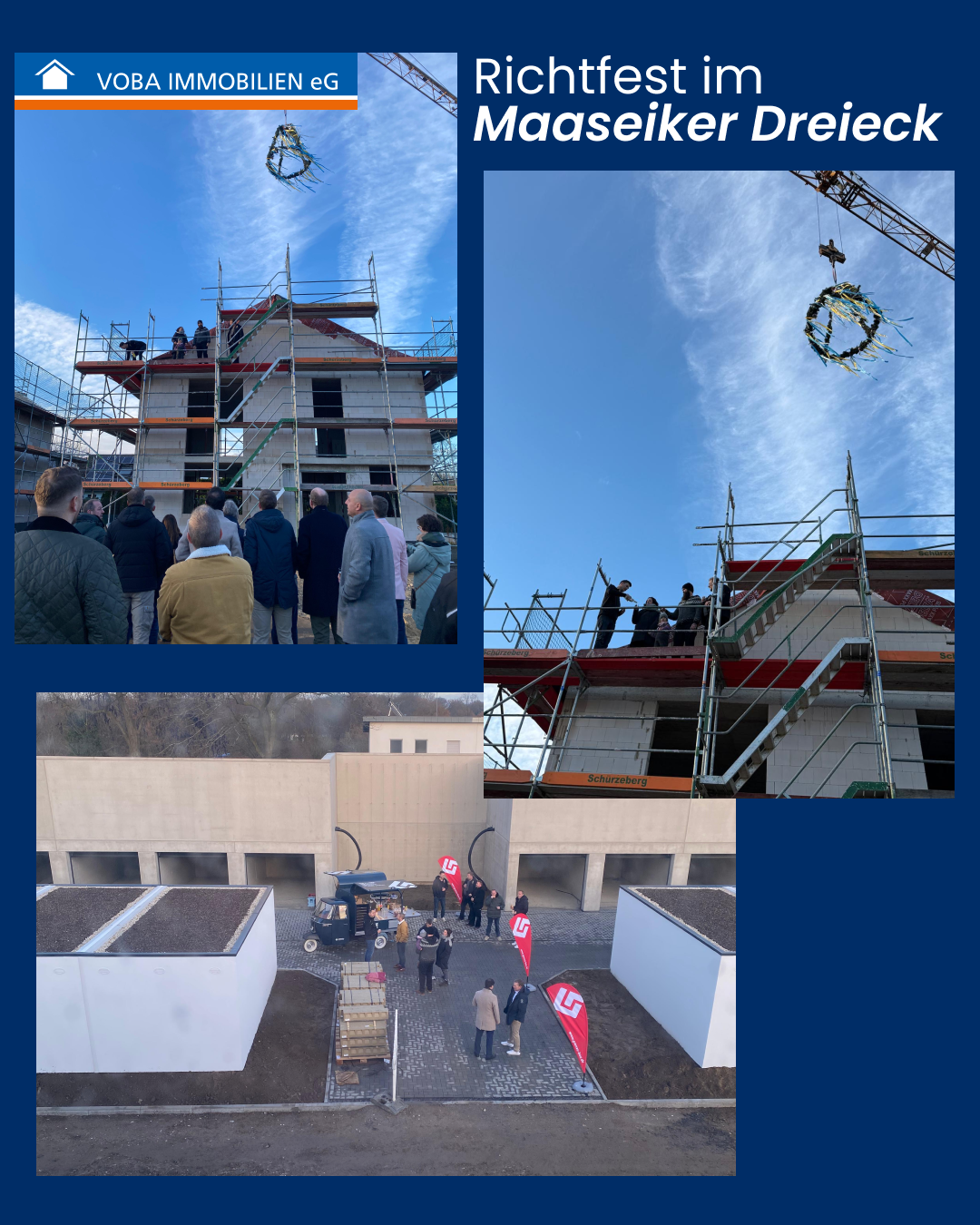 „Wir haben Wort gehalten, das Gebiet entwickelt sich zu einer echten Erfolgsgeschichte“, so Oliver Müller, Bankkaufmann und Gebietsleiter der Voba Immobilien Wegberg und als solcher federführend zuständig für die Vermarktung des Neubaugebietes „Maaseiker Dreieck“. Das Projekt ist „optimal gestartet“, so Müller stolz beim Richtfest vor Ort, der darauf verweist, dass im ersten Bauabschnitt, wie vor einem Jahr angekündigt, zunächst vier Quader mit insgesamt 22 Wohnungen erstellt werden, die innerhalb kurzer Zeit komplett verkauft waren. Deren endgültige Fertigstellung (Bezug) ist für Frühjahr 2026 vorgesehen. Wegen der hohen Nachfrage werden nun noch acht weitere Eigentumswohnungen geplant.